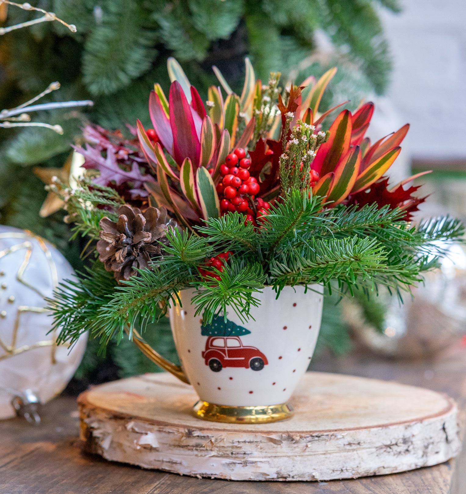 Centro de mesa navideño con pino, proteas y algodón
